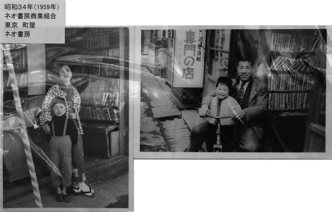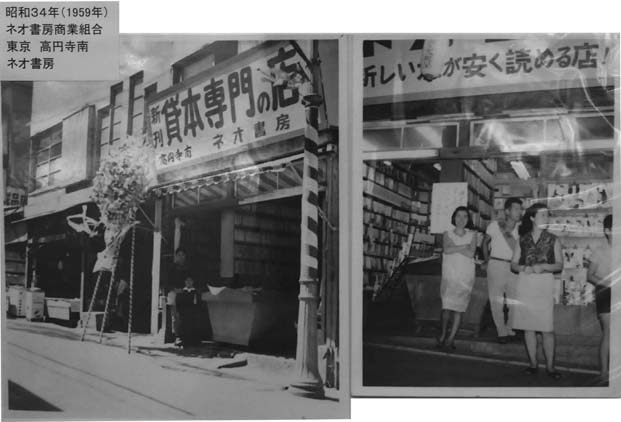 1950年代前半から15年間ほど町のいたるところに貸本店があった。 当時私が暮らしていた福岡にも、子どもの足で15分圏内に3、4軒の貸本店があった。 いや、ここでは貸本店ではなく、子どものころのように貸本屋と呼ぼう。 しかし、不思議なことに貸本屋の写真はあまり残っていない。街頭紙芝居の写真は見かけることも多いのだが、貸本屋の写真はなぜか少ない。 最盛期には全国に3万軒もあったといわれる貸本屋だが、その写真が少ないのは、町の風景のなかに溶け込んで、被写体としておもしろいものではなかったのかもしれない。 そのような貴重な貸本屋の写真を、先日報告した「東京読書普及商業協同組合創立55周年記念祝賀会」会場に設置されたパネルで見ることができた。どちらも50年代後半の東京のネオ書房の店舗である。パネルに掲示された小さな写真を撮影したものだから、画質は悪いけれど、ここに掲示する。